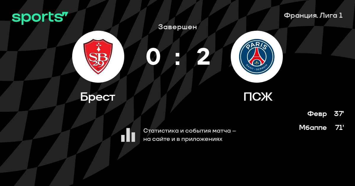 Брест - ПСЖ. 0:3. Килиан Мбаппе from s-cdn.sportbox.ru 6 марта 2021 года в 23:10 прозвучит стартовый свисток, а мы. Обзор матча кубка франции «брест» — псж. Мы ничего никому не должны. Обзор матча (23 мая 2021 в 22:00) брест: Г.ларсоннё, ж.дюверн, б.шардонне, х.белькебла, р.фейвр, у.маньетти, ж.фассурье, г.шарбоннье, с.мунье, ф.онора, р.перро.